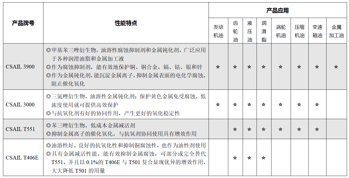 產(chǎn)品詳情 CSAIL 3900-TDS-CN 技術(shù)咨詢三唑衍生物 CSAIL 3000 是一種高性能化學(xué)添加劑,專門設(shè)計(jì)用于各種潤(rùn)滑油和油脂中的金屬鈍化劑。作為液體、油溶性三唑衍生物,它為黃色金屬提供卓越的防腐蝕保護(hù),確保這些關(guān)鍵部件有效運(yùn)行并延長(zhǎng)使用壽命。